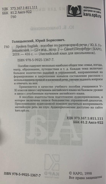 Жанр Грамматика Возрастные ограничения 0+ Переплет Мягкий Язык Английский Количество страниц 416 Страна производителя Россия Серия Голицынский Ю.Б. Spoken English Автор Голицынский Ю.Б. Год Издания 2019 Формат Печатная книга Возраст Студенты и взрослые Производитель Каро