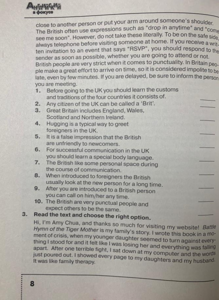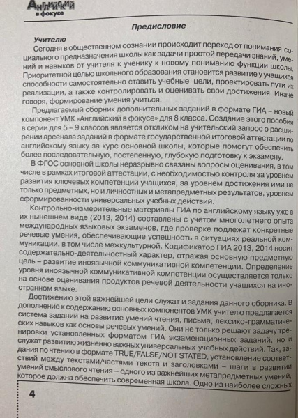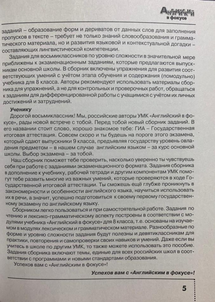 Предлагаемый сборник является дополнительным компонентом УМК серии «Английский в фокусе» для 8 класса общеобразовательных организаций авторов Ю. Е. Ваулиной, Д. Дули, О. Е. Подоляко и др. В сборнике предлагается система заданий на развитие умений чтения, письма, лексико-грамматических навыков как основы речевых умений. Сборник не только решает задачу тренировки установленных форматов экзаменационных заданий, но и служит развитию универсальных учебных действий согласно требованию ФГОС основного общего образования. Материалы пособия можно использовать на уроках английского языка и дома самостоятельно.