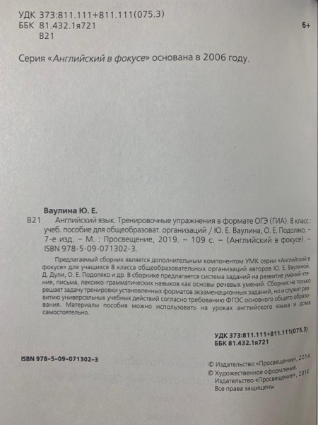 Жанр Учебники Возрастные ограничения 0+ Переплет Мягкий Язык Английский Количество страниц 112 Страна производителя Россия Серия Английский в фокусе (Spotlight) Автор Ваулина Ю.Е., Подоляко О.Е. Год Издания 2022 Формат Печатная книга Возраст Средняя школа Производитель Просвещение