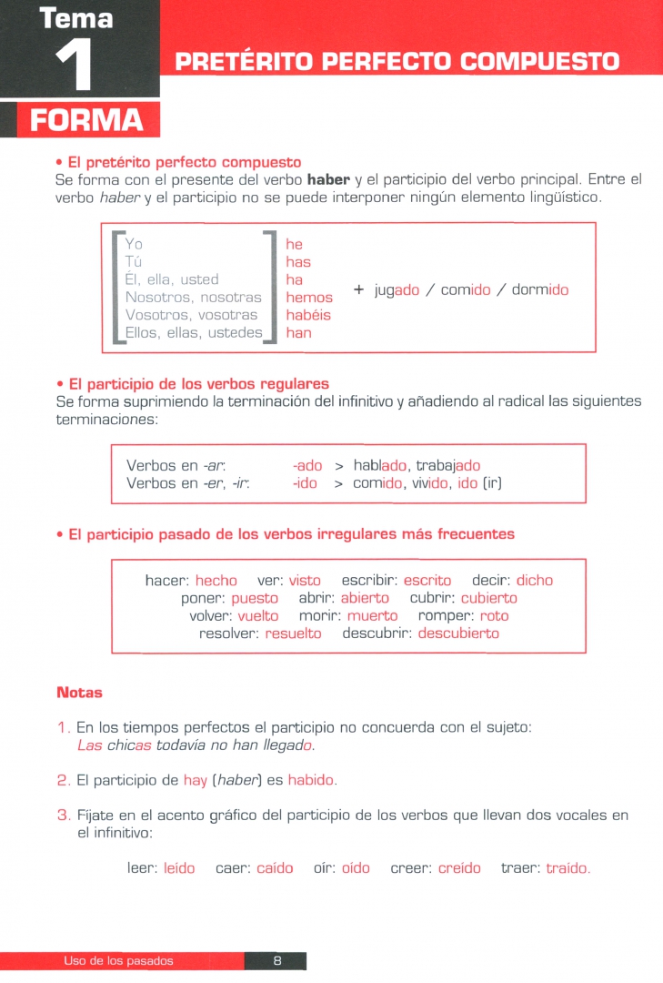Книга состоит из 6 тем. Каждая тема рассматривает форму и использование прошедшего времени (настоящее совершенное, претерит, несовершенное и другие прошедшие времена), за исключением Темы 3, которая сравнивает два прошедших совершенных времени - простое и настоящее совершенное, и Темы 5, которая сравнивает простое и несовершенное прошедшее время.