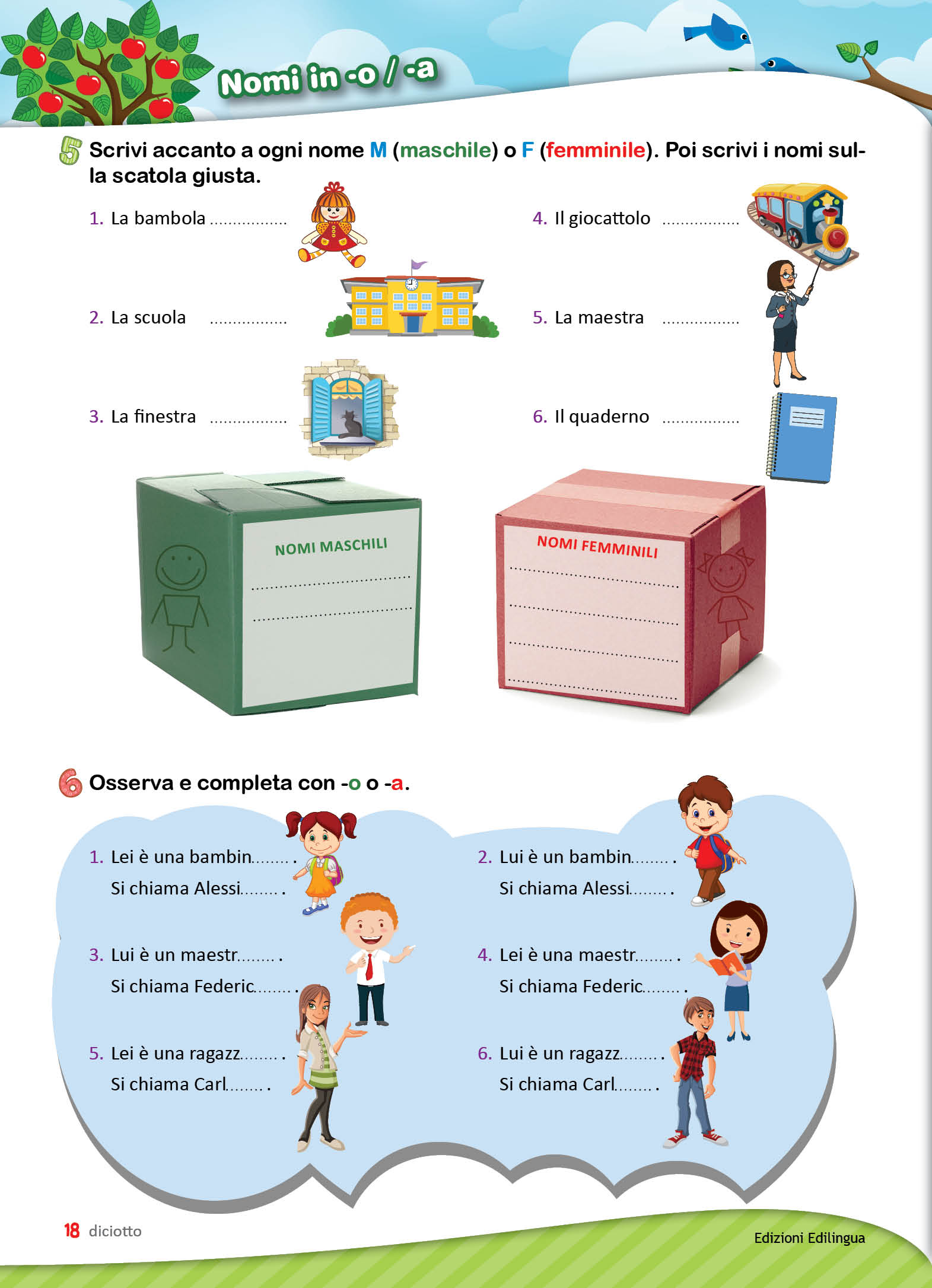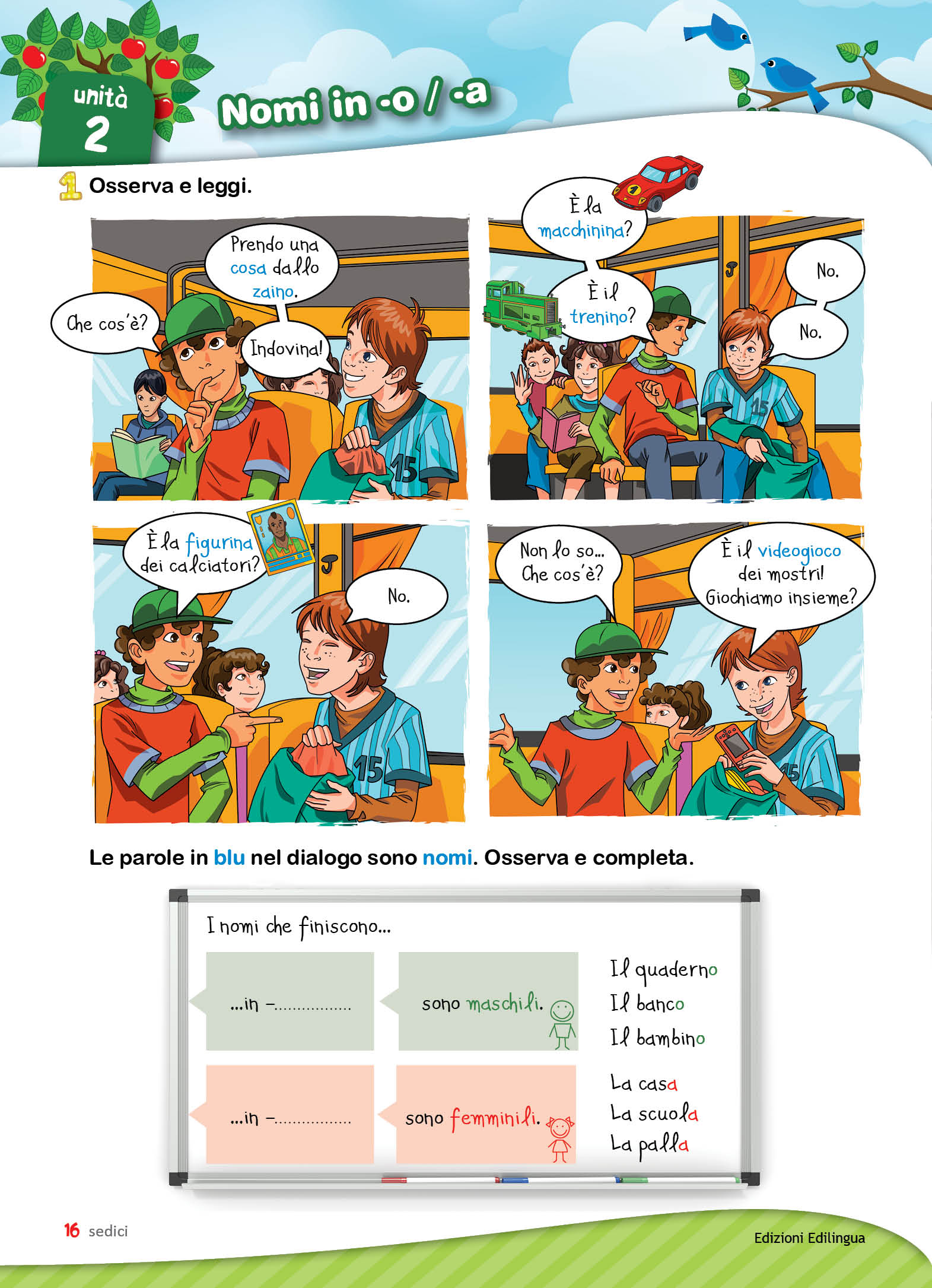Грамматические понятия, всегда представленные в контексте, организованы по возрастающей сложности, и пособие может быть использовано вместе с любым итальянским детским учебником.