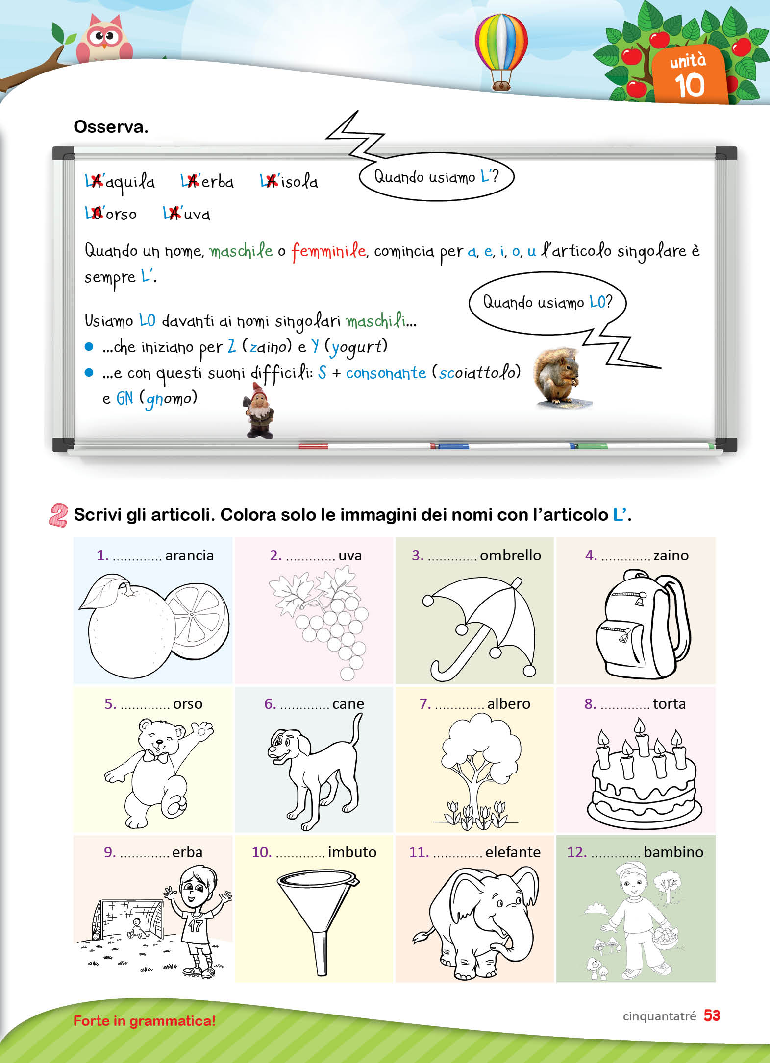 «Forte in grammatica!» — это базовый курс грамматики для детей от 7 до 11 лет, который излагает грамматические понятия ясно, интуитивно и в игровой форме. Помимо графических элементов, разработанных специально для детей, учащиеся эмоционально вовлекаются в процесс обучения благодаря сюжету о приключениях группы сверстников в школьной поездке, проходящему через каждый раздел.