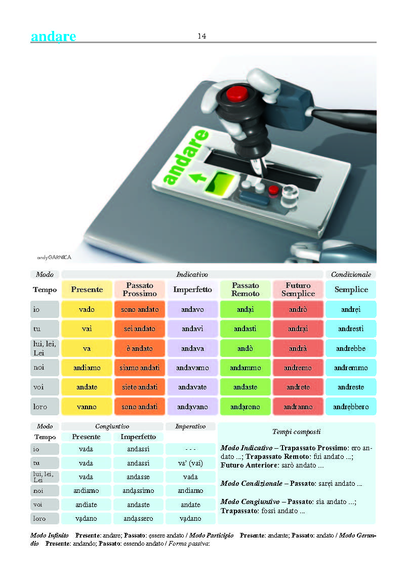 - спряжение глаголов, включая пассивную форму, где это возможно, в двух красочных и интуитивно понятных таблицах, содержащих 101 итальянский глагол;
