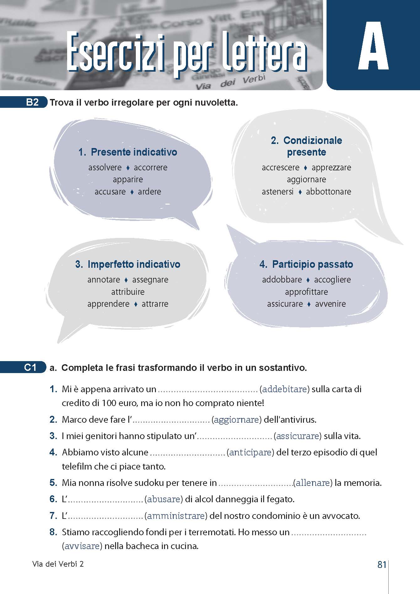 Пособия Via dei Verbi предназначены для подростков и взрослых, желающих углубить свои знания итальянских глаголов, и являются ценным инструментом, к которому можно обратиться в любое время, чтобы на примерах понять значение глаголов в контексте или прочитать перевод на родном языке.