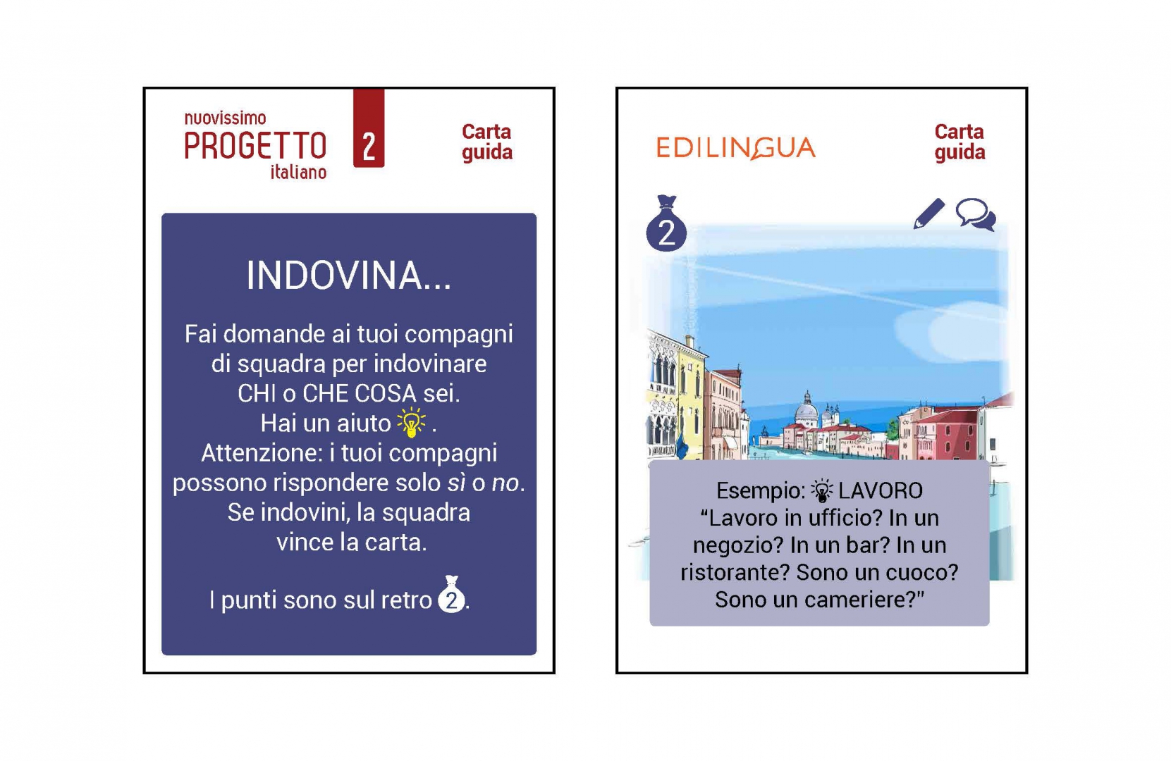 - INDOVINA - Игрок должен угадать, кто или что он (например, профессия, место, объект), задавая другим игрокам вопросы только с ответами да или нет