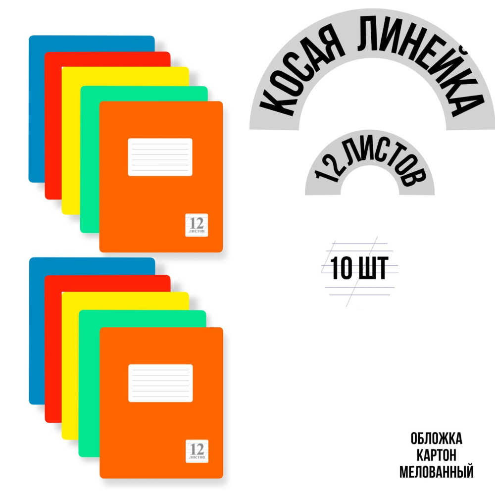 Комплект из тетрадей школьных всех цветов Косая Линейка 12 листов - 10 штук