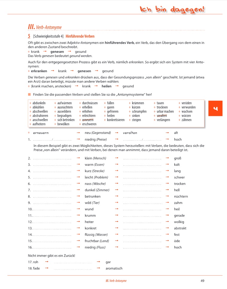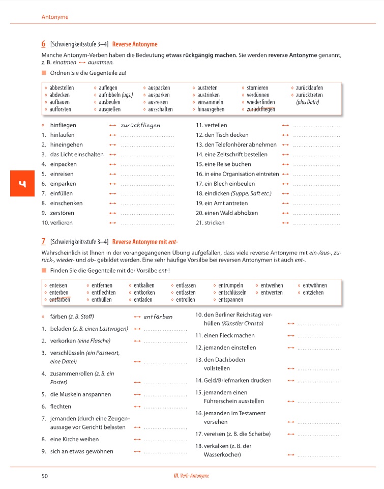 Главы 3 (Синонимы), 4 (Антонимы), 5 (Омонимы), 6 (Словообразовательные семьи) и 7 (Сочинение) подходят для учащихся начиная с уровня B2. Здесь лексика расширяется посредством различных структур и структурных правил, а также начинается работа над стилистическими аспектами.