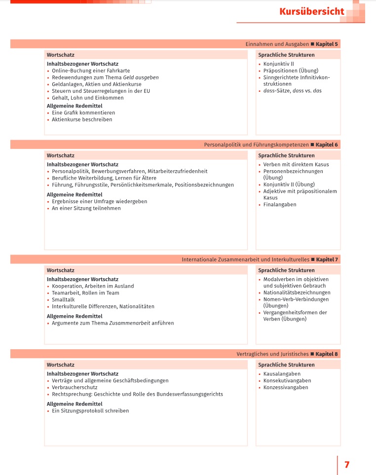 Учебник состоит из восьми глав, каждая из которых посвящена сферам деятельности различных отделов компании/учреждения и задачам на уровне управления и руководства. Особое внимание уделяется повседневному общению, такому как командные совещания, управление проектами, переговоры с деловыми партнерами, процессы подачи заявок и многое другое, а также развитию навыков письменной речи для соответствующих типов текстов, таких как электронные письма, протоколы совещаний и различные виды договоров.