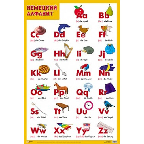 C помощью этого плаката ребенок сможет сделать первые шаги в изучении немецкого языка: выучить алфавит, познакомиться с произношением немецких букв внутри слов, запомнить первые слова на иностранном языке. Рядом с каждой буквой изображены предметы, в названии которых данная буква является первой, что служит подсказкой для ребенка и помогает получать знания в игровой форме.