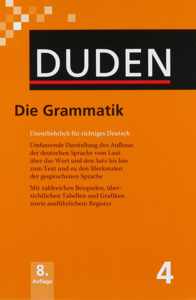 Duden 4 Die Grammatik - основательный словарь, который предоставляет полную теоретическую и практическую информацию по всем аспектам и явлениям современной немецкой грамматики, начиная от объяснения понятия фонемы и графема, заканчивая определением видов текстов,анализом особенностей устной и письменной языковых практик, а также разъяснением типов речевых коммуникаций. Словарь имеет удобную структуру и примеры использования информации.