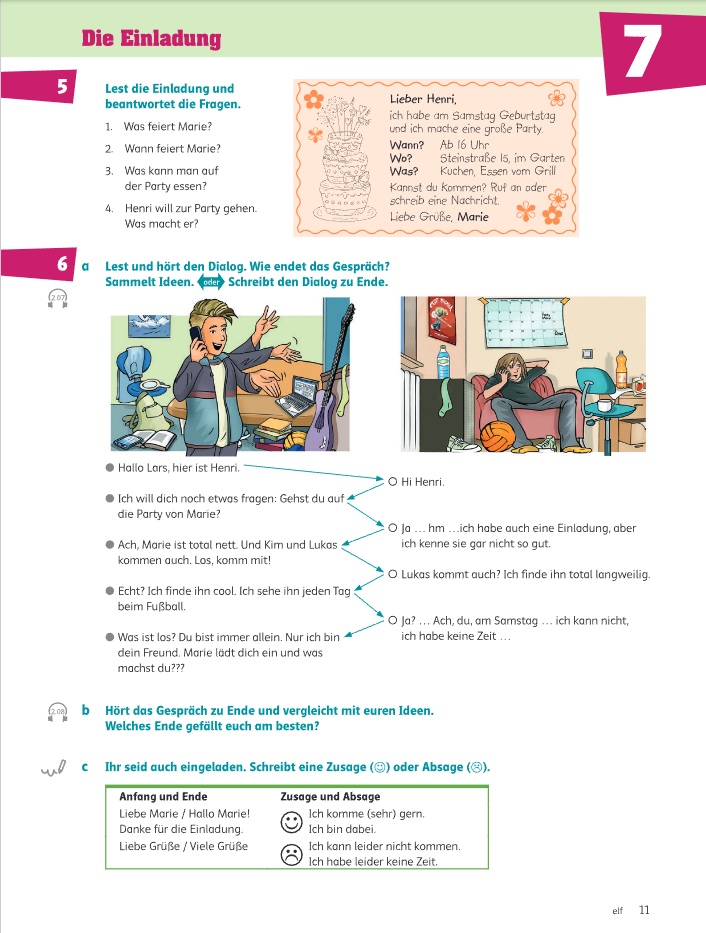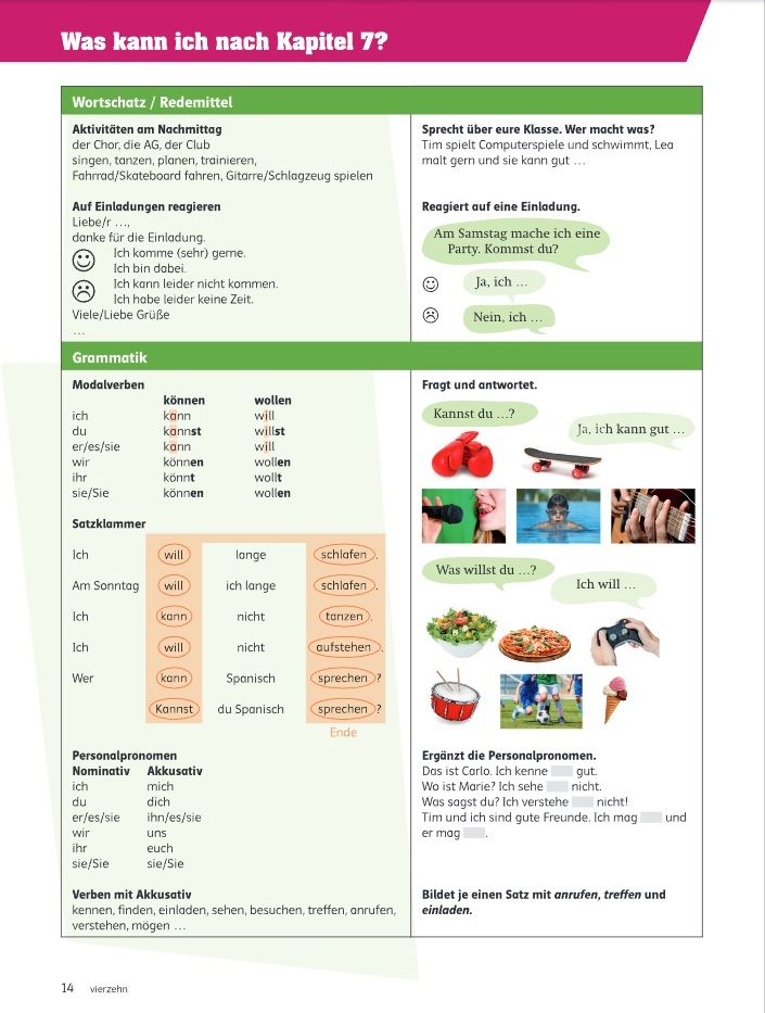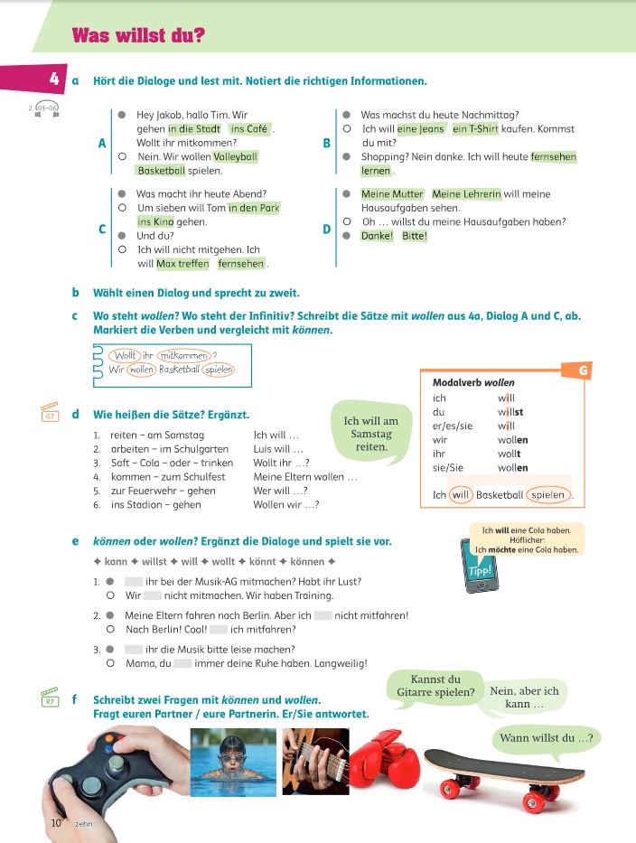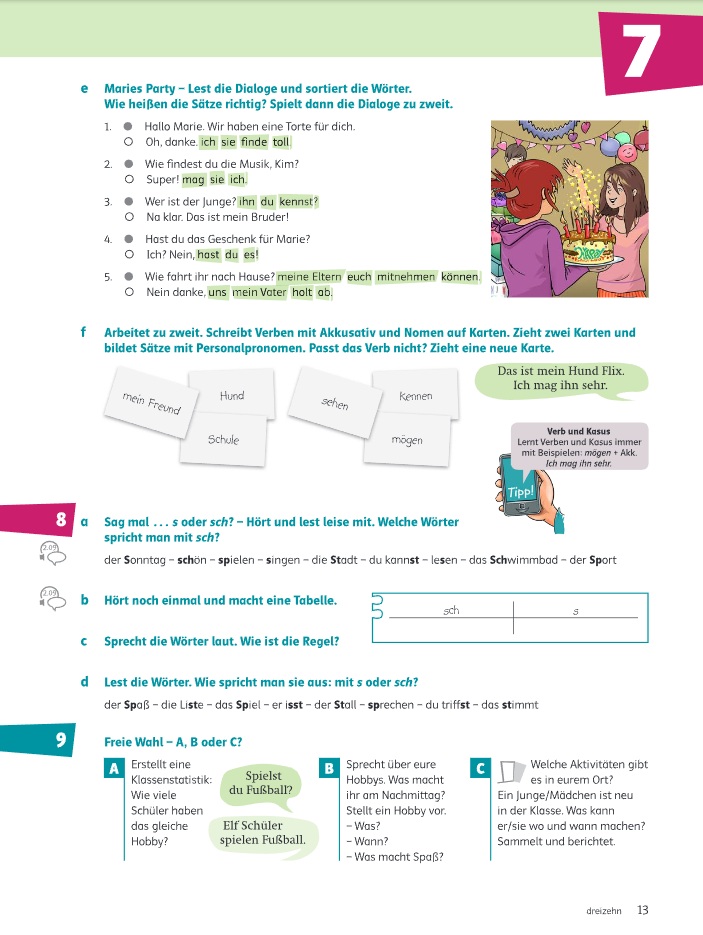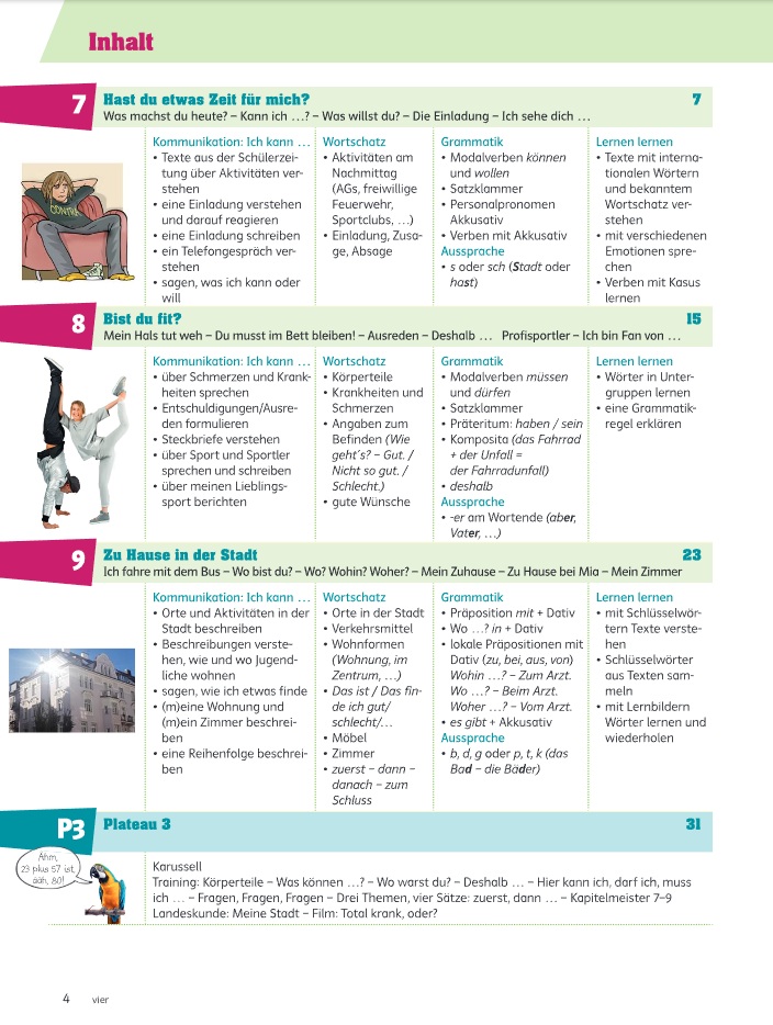 Молодежные темы и юмористические комиксы мотивируют к разговору, видеоролики показывают повседневную жизнь и культуру Германии, а грамматические видео объясняют новые структуры. Разделы «Плато» и «Свободный выбор» помогают лучше усвоить материал и дают свободу выбора заданий. Игровые упражнения развивают беглость речи, а страницы для самооценки стимулируют ответственность за обучение. Грамматические таблицы для письма способствуют закреплению пройденного и доступны онлайн в виде бесплатных шаблонов.