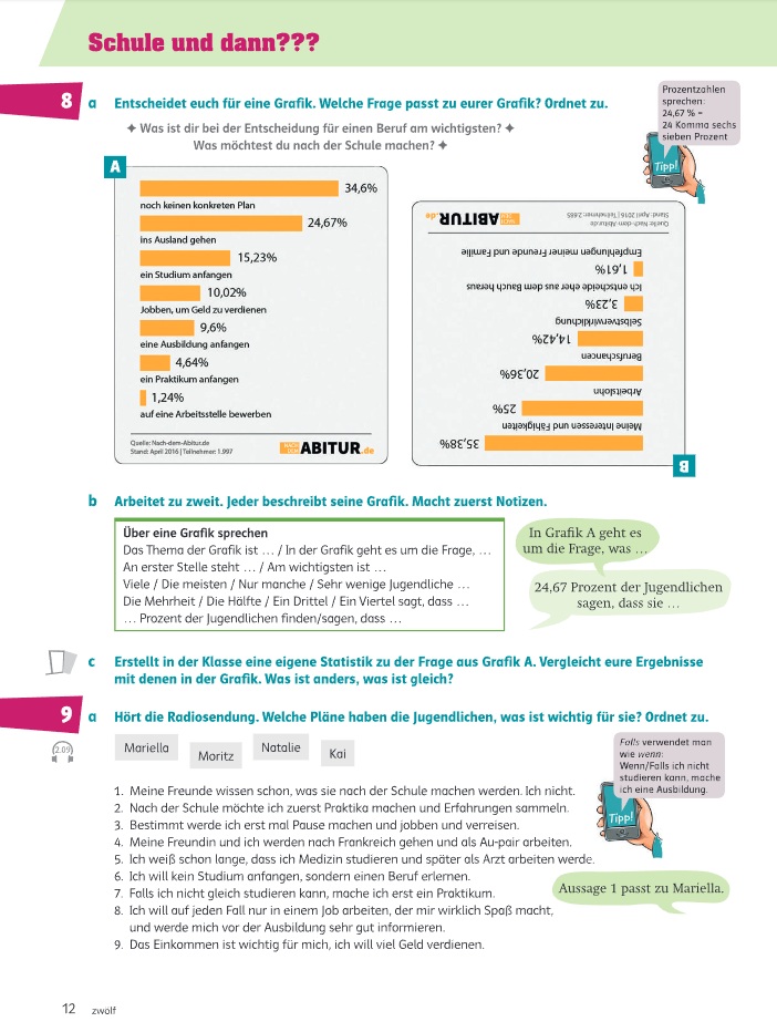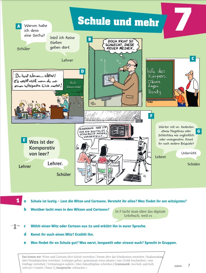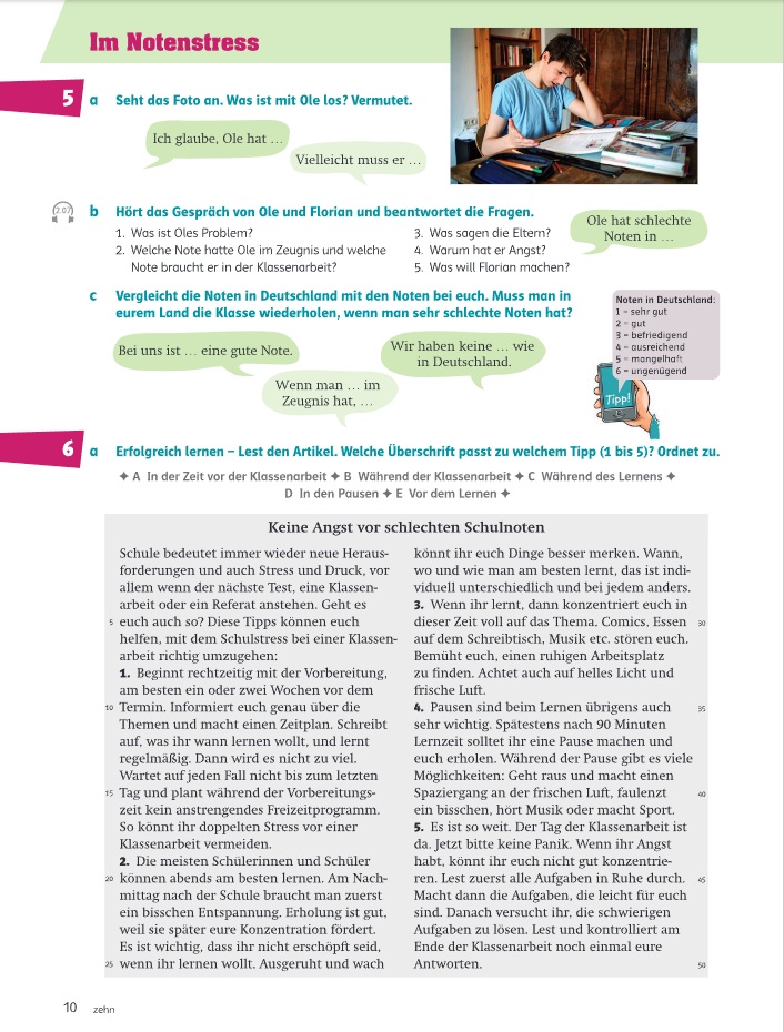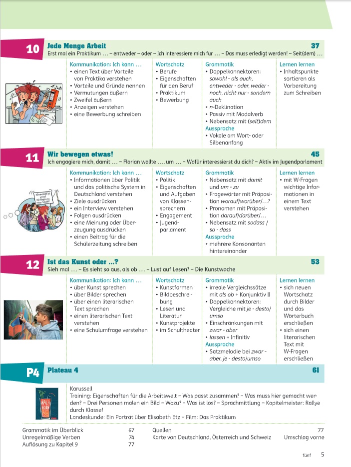 Молодежные темы и юмористические комиксы мотивируют к разговору, видеоролики показывают повседневную жизнь и культуру Германии, а грамматические видео объясняют новые структуры. Разделы «Плато» и «Свободный выбор» помогают лучше усвоить материал и дают свободу выбора заданий. Игровые упражнения развивают беглость речи, а страницы для самооценки стимулируют ответственность за обучение. Грамматические таблицы для письма способствуют закреплению пройденного и доступны онлайн в виде бесплатных шаблонов.