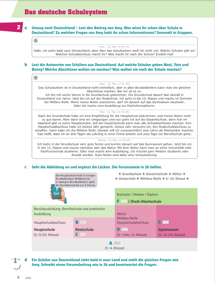 Включает широкий спектр бесплатных медиаматериалов (аудио, видео, онлайн-упражнения, LMS), обеспечивая разнообразие способов подачи учебного материала для лучшего усвоения знаний. Упражнения по многоязычию и медиации (с уровня A2) связывают язык с реальной жизнью, а задания CLIL интегрируют немецкий язык с другими предметами.