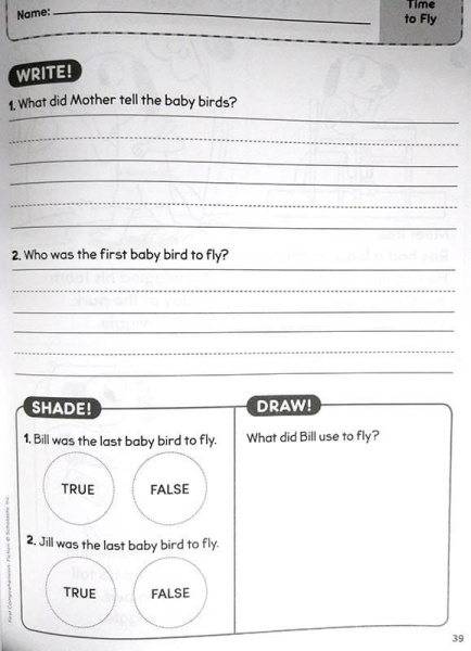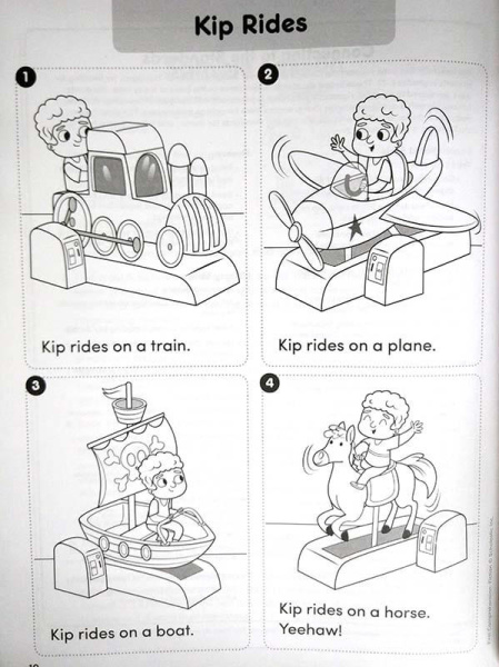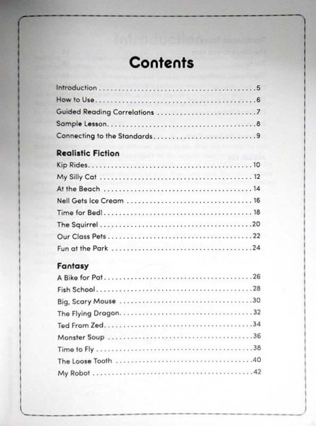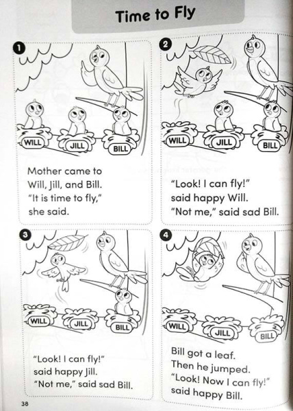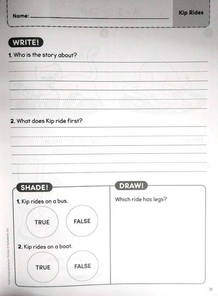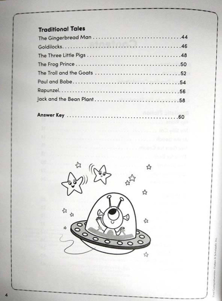 Каждая история расположена на одной странице, разделенной на 4 части, дети читают надписи под иллюстрациями, а затем отвечают на вопросы при помощи слов и рисунков. Поскольку здесь не нужно много писать, то контент идеально подходит для учащихся разных возрастов и разного уровня знания языка. Истории мотивируют своим разнообразием - здесь есть реалистические, фантастические и классические расказы - и соотносятся с Guided Reading Levels A-E. -