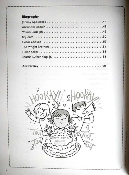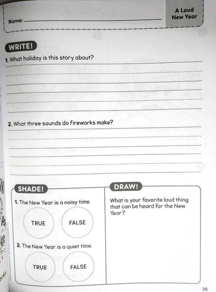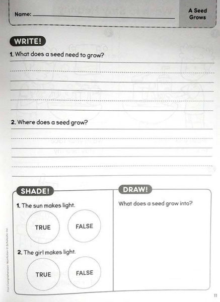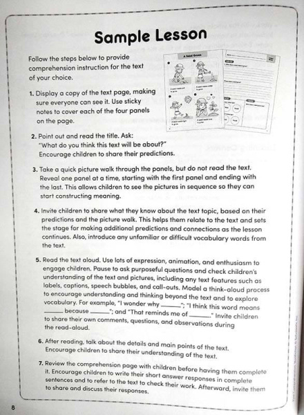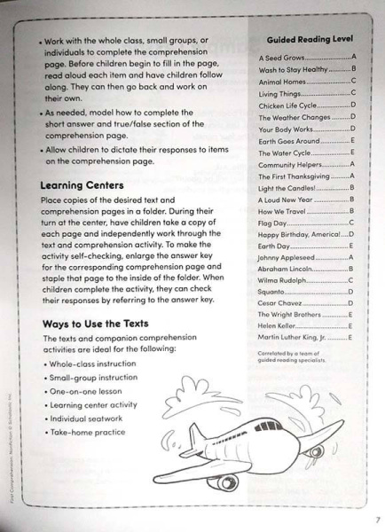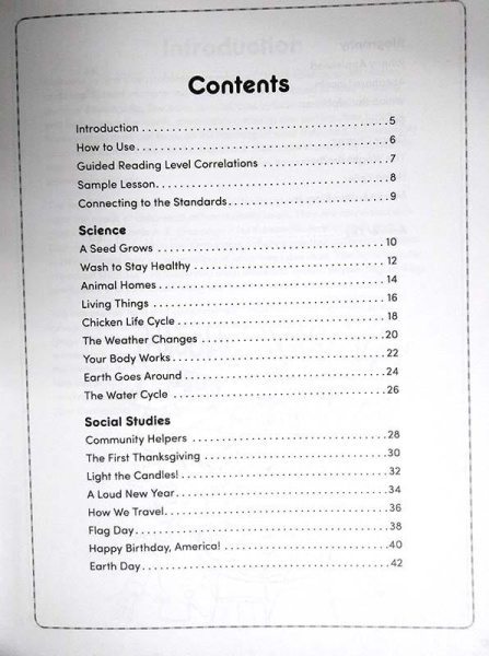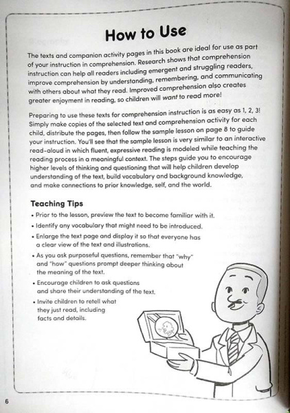 Каждая история расположена на одной странице, разделенной на 4 части, дети читают надписи под иллюстрациями, а затем отвечают на вопросы при помощи слов и рисунков. Поскольку здесь не нужно много писать, то контент идеально подходит для учащихся разных возрастов и разного уровня знания языка. Рассказы, которые соотносятся с Guided Reading Levels A-E, включают в себя идеальное сочетание биографии, социальных исследований и научных тем. -