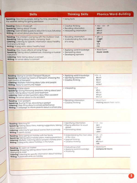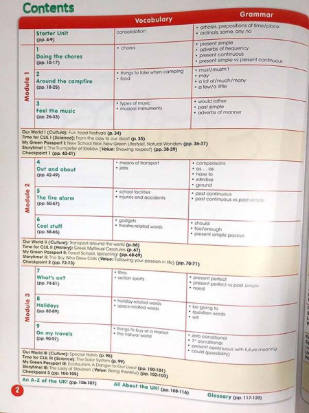 Пособие состоит из трех модулей, а каждый модуль из 3 юнитов. После каждого модуля идут следующие разделы: Our World (Culture), Time for CLIL, My Green Passport, Storytime и Check Point. В учебника представлены разделы, посвященные британской культуры: An A-Z of the UK! и All About the UK! а также англо-английский словарь. -