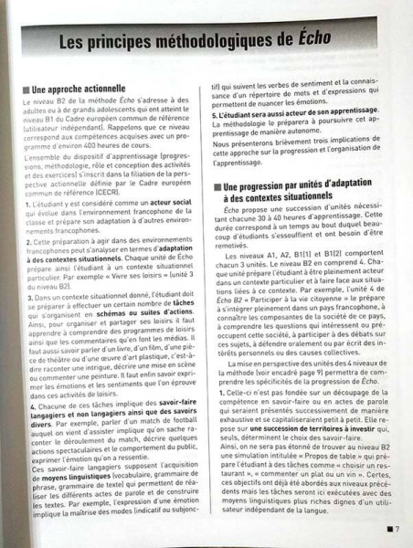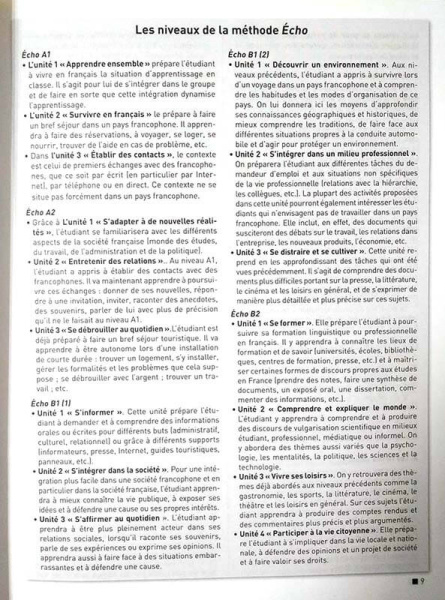 Новая версия ECHO состоит из 5 уровней, которые соответствуют шкале Совета Европы:A1A2B1 (В1.1, В1.2)B2Книга для учащегося снабжена: