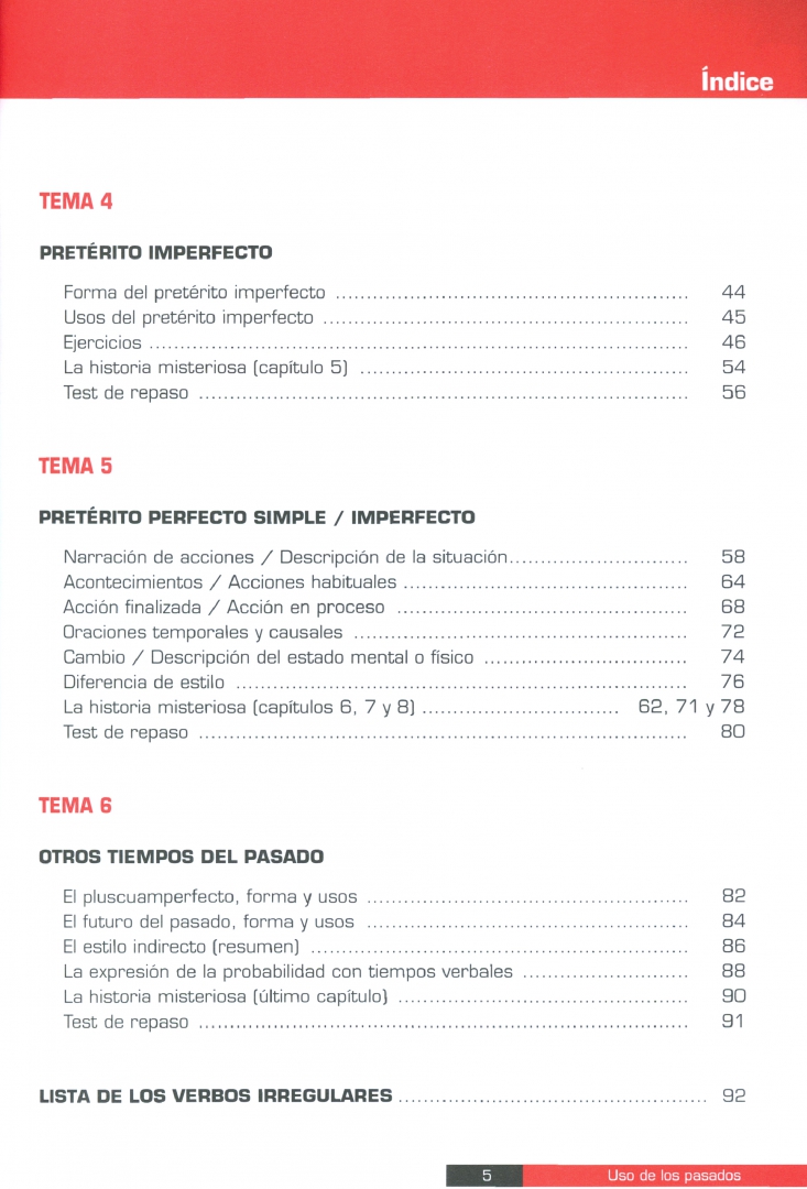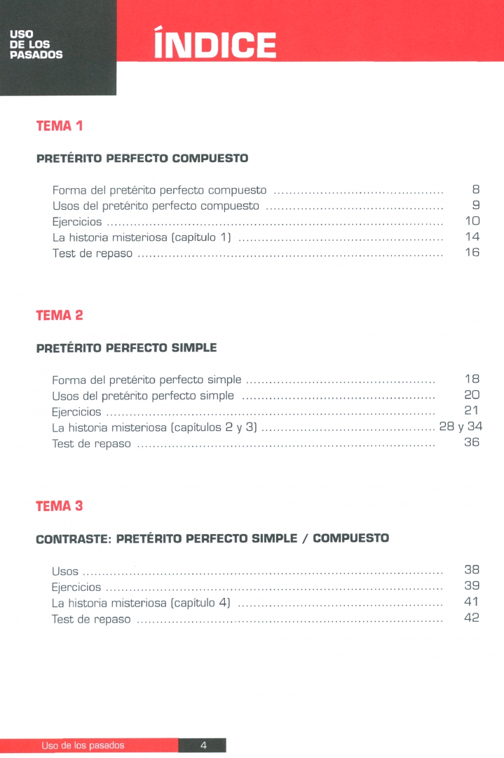 Книга состоит из 6 тем. Каждая тема рассматривает форму и использование прошедшего времени (настоящее совершенное, претерит, несовершенное и другие прошедшие времена), за исключением Темы 3, которая сравнивает два прошедших совершенных времени - простое и настоящее совершенное, и Темы 5, которая сравнивает простое и несовершенное прошедшее время.