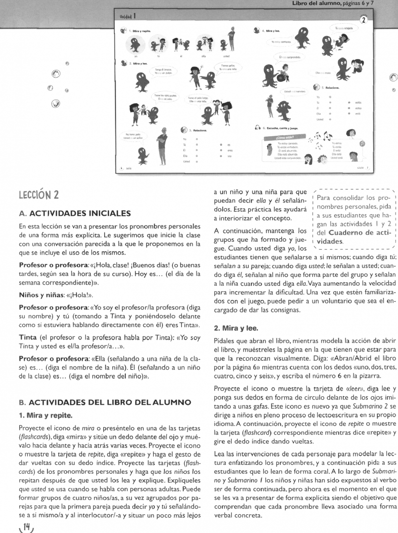 «Submarino» - курс обучения испанскому языку для дошкольников и в начальной школе. Главных героев «Submarino» зовут Валентина и Матео, и они путешествуют на подводной лодке со своим питомцем, Тинтой, дружелюбным и озорным осьминогом, который будет сопровождать детей в их первом путешествии в мир испанского языка. Работа направлена на усвоение лексики и основных структур испанского языка в игровой форме в качестве основы для перехода к реальному обучению.
