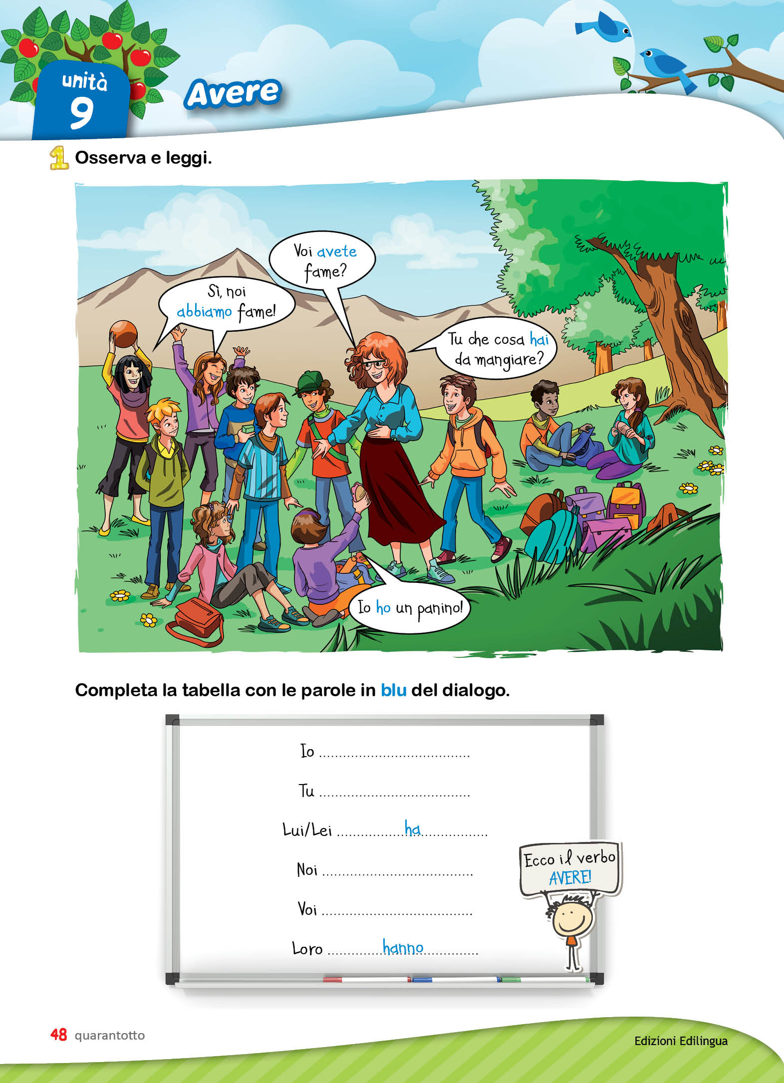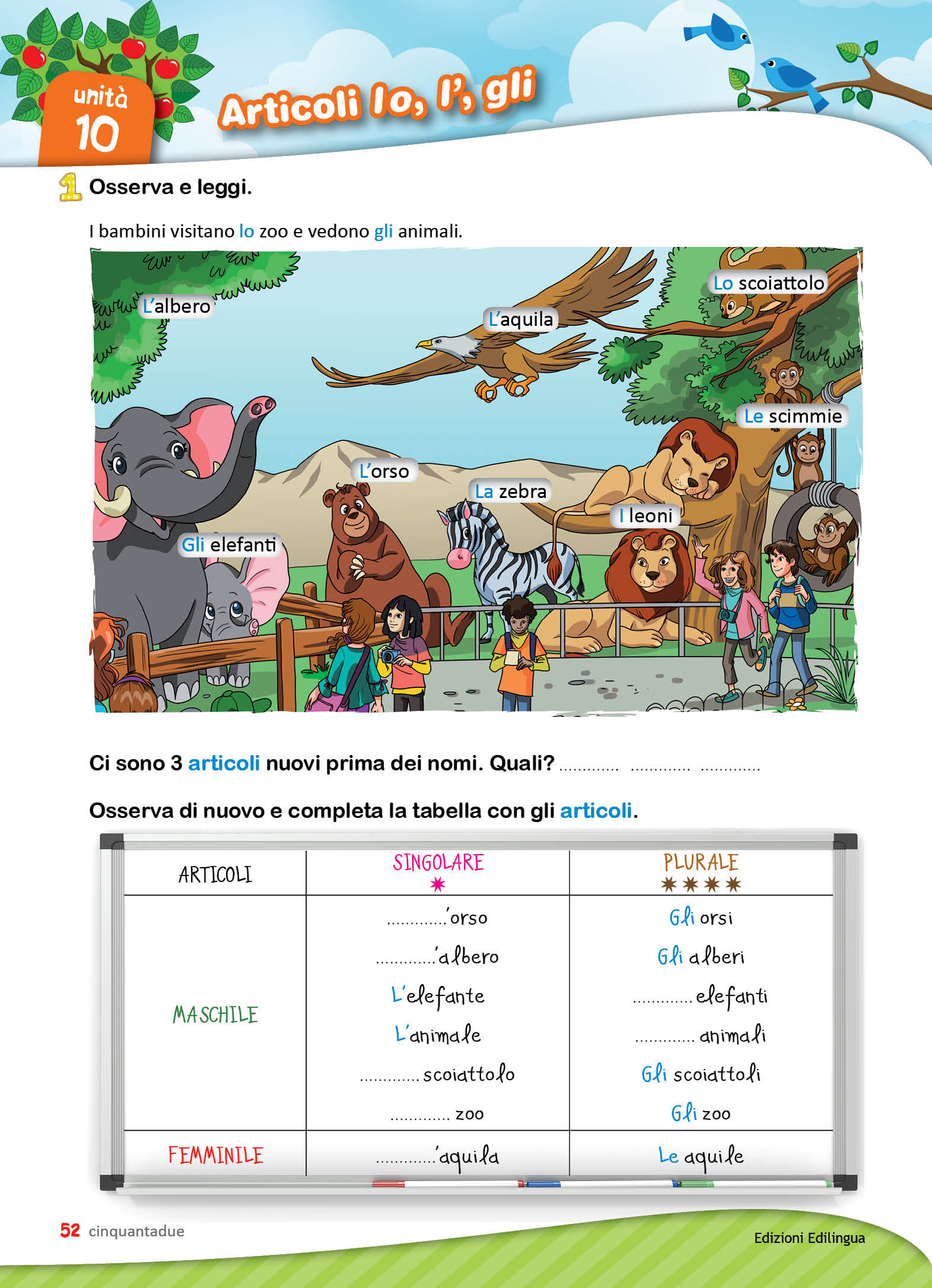 Грамматические понятия, всегда представленные в контексте, организованы по возрастающей сложности, и пособие может быть использовано вместе с любым итальянским детским учебником.