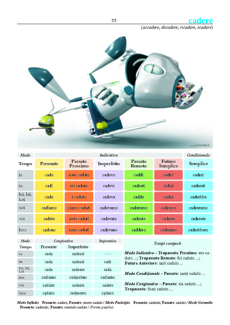 - спряжение глаголов, включая пассивную форму, где это возможно, в двух красочных и интуитивно понятных таблицах, содержащих 101 итальянский глагол;