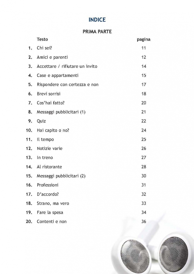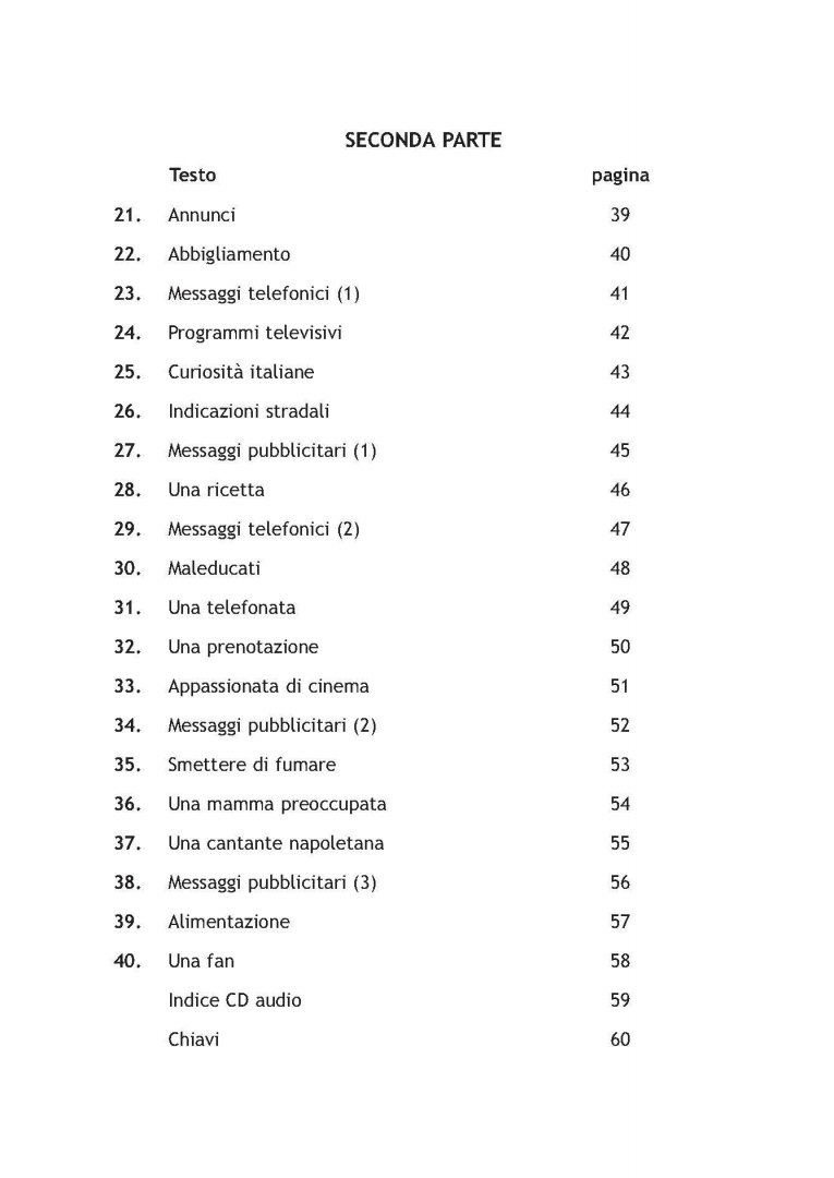Сборник из 40 аудиозаписей, которые помогут учащимся всех возрастов улучшить произношение и интонацию, а также подготовиться к тестам на понимание прочитанного на различных языковых экзаменах (CELI Impatto и CELI 1, CILS A1 и CILS A2, PLIDA A1 и PLIDA A2 и другие подобные экзамены).
