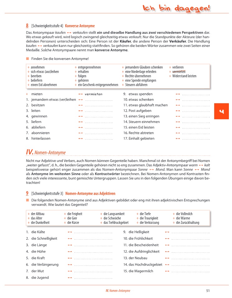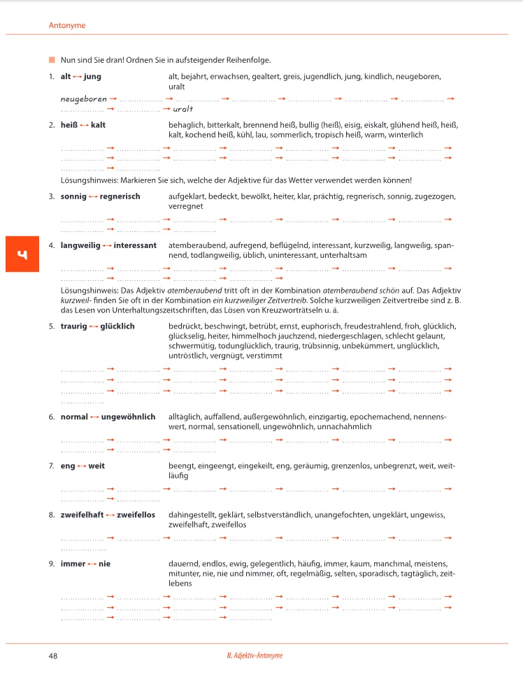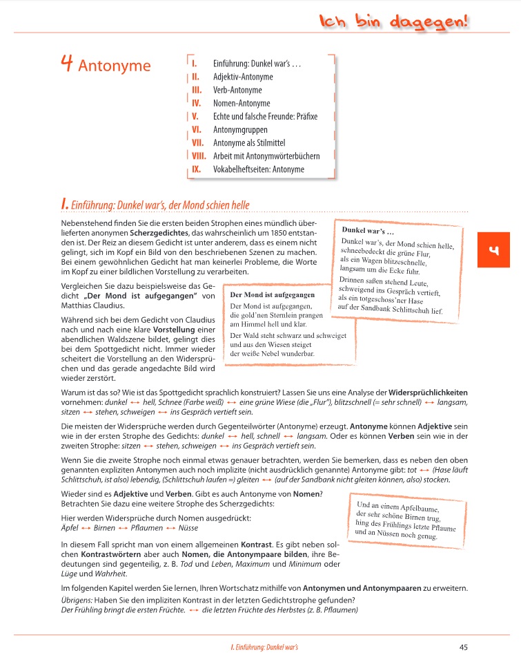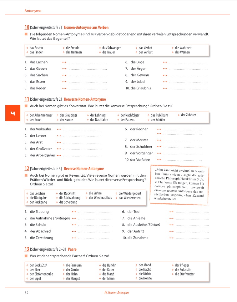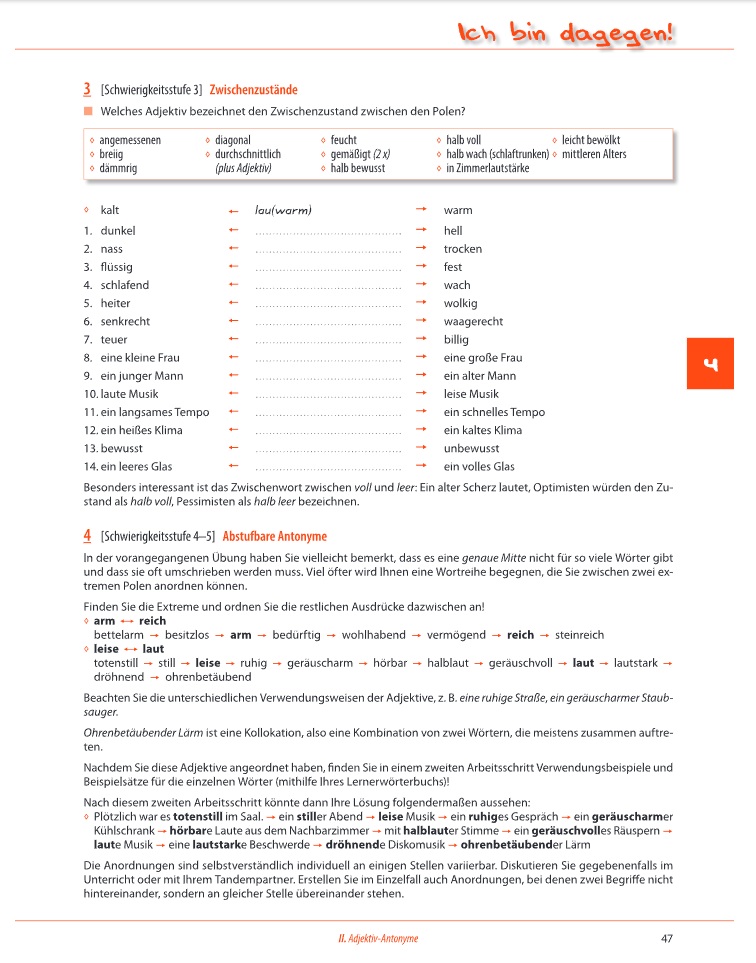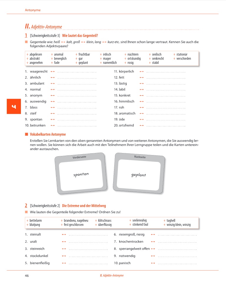 Главы 3 (Синонимы), 4 (Антонимы), 5 (Омонимы), 6 (Словообразовательные семьи) и 7 (Сочинение) подходят для учащихся начиная с уровня B2. Здесь лексика расширяется посредством различных структур и структурных правил, а также начинается работа над стилистическими аспектами.