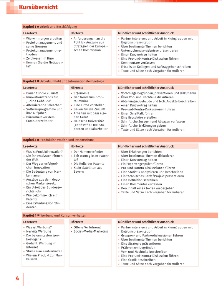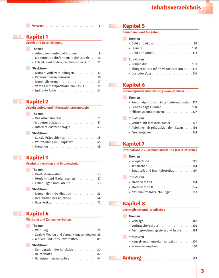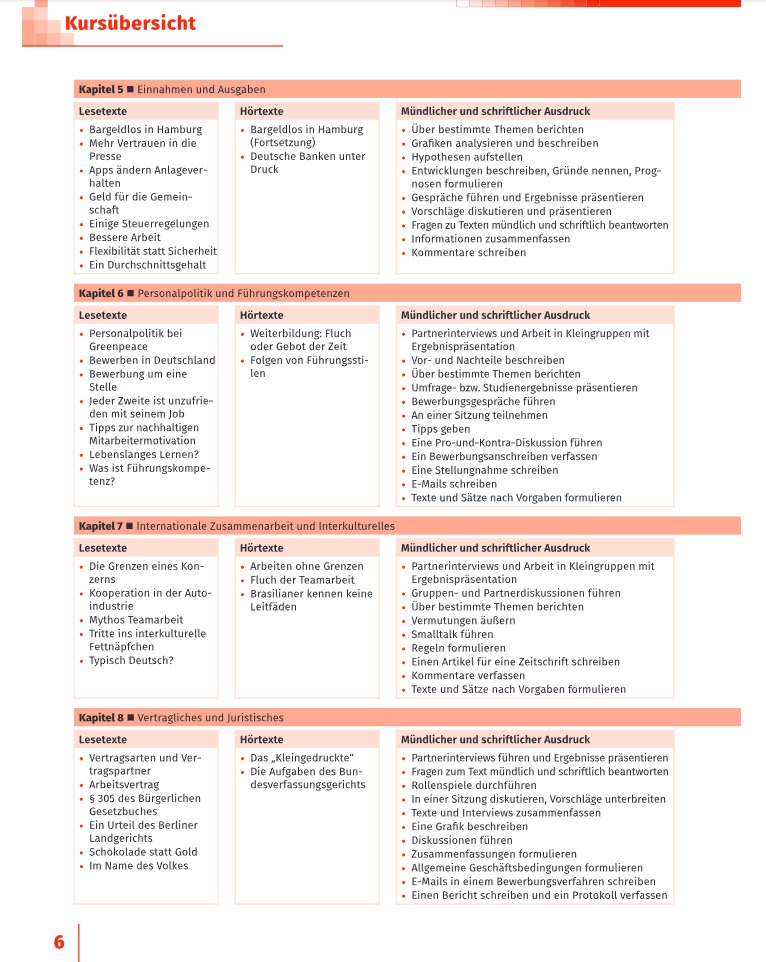 Учебник состоит из восьми глав, каждая из которых посвящена сферам деятельности различных отделов компании/учреждения и задачам на уровне управления и руководства. Особое внимание уделяется повседневному общению, такому как командные совещания, управление проектами, переговоры с деловыми партнерами, процессы подачи заявок и многое другое, а также развитию навыков письменной речи для соответствующих типов текстов, таких как электронные письма, протоколы совещаний и различные виды договоров.