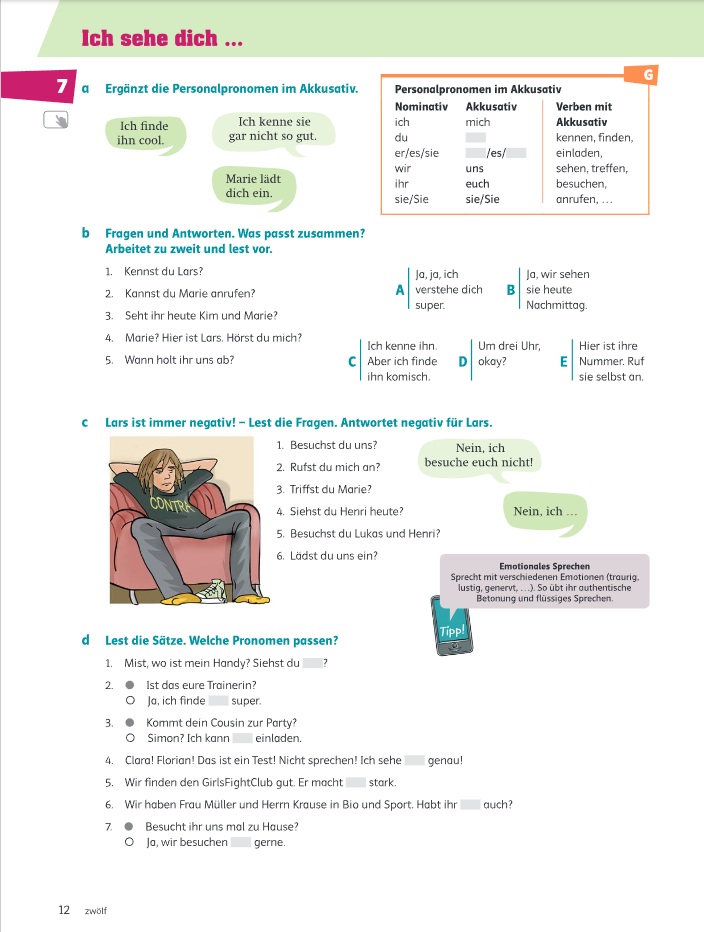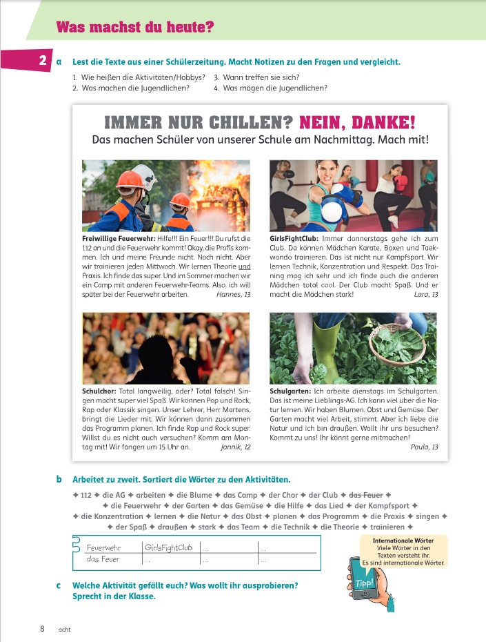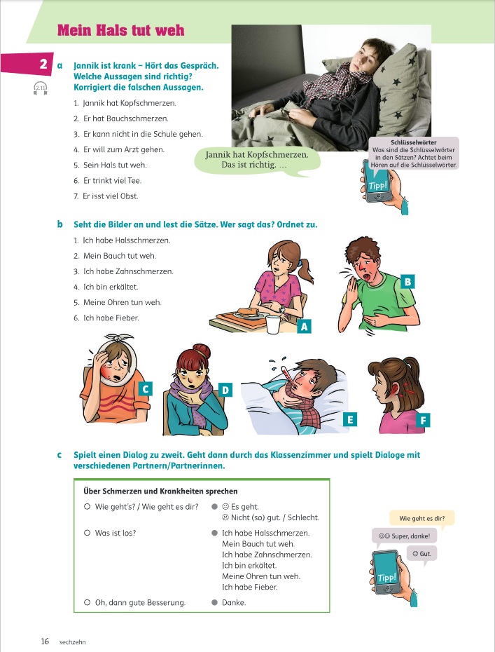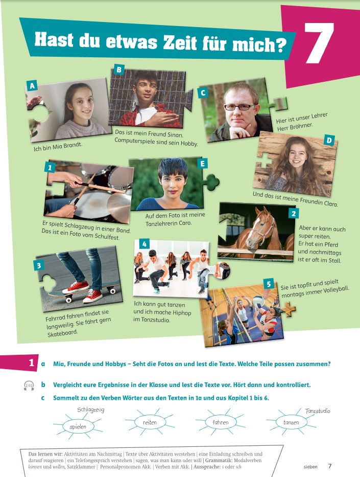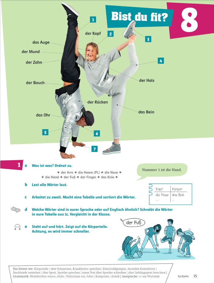Молодежные темы и юмористические комиксы мотивируют к разговору, видеоролики показывают повседневную жизнь и культуру Германии, а грамматические видео объясняют новые структуры. Разделы «Плато» и «Свободный выбор» помогают лучше усвоить материал и дают свободу выбора заданий. Игровые упражнения развивают беглость речи, а страницы для самооценки стимулируют ответственность за обучение. Грамматические таблицы для письма способствуют закреплению пройденного и доступны онлайн в виде бесплатных шаблонов.