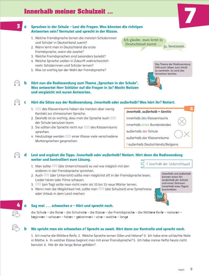 Включает широкий спектр бесплатных медиаматериалов (аудио, видео, онлайн-упражнения, LMS), обеспечивая разнообразие способов подачи учебного материала для лучшего усвоения знаний. Упражнения по многоязычию и медиации (с уровня A2) связывают язык с реальной жизнью, а задания CLIL интегрируют немецкий язык с другими предметами.