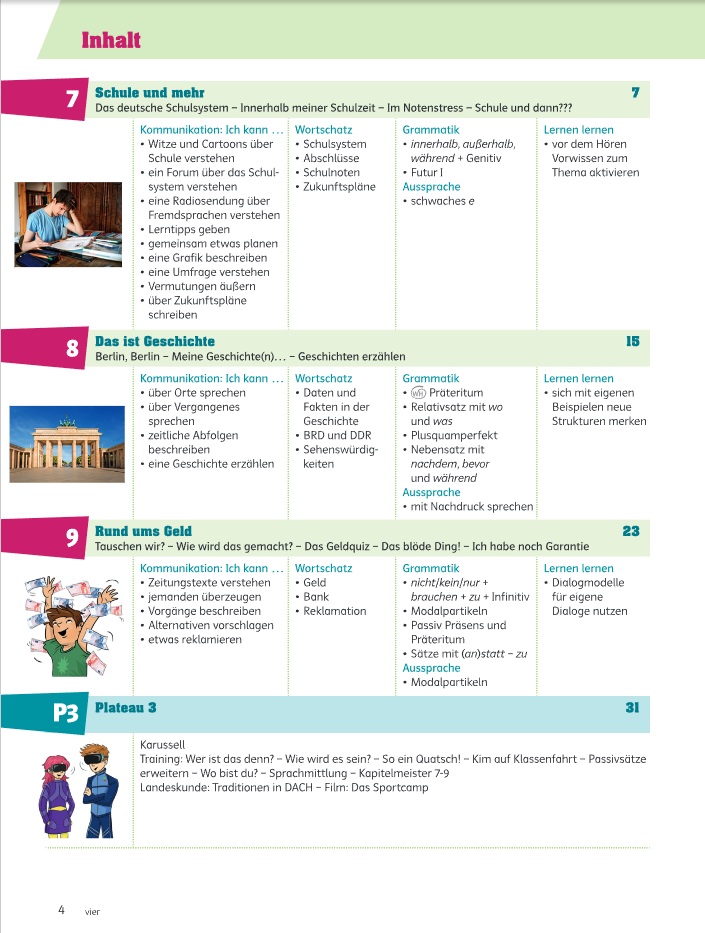 Молодежные темы и юмористические комиксы мотивируют к разговору, видеоролики показывают повседневную жизнь и культуру Германии, а грамматические видео объясняют новые структуры. Разделы «Плато» и «Свободный выбор» помогают лучше усвоить материал и дают свободу выбора заданий. Игровые упражнения развивают беглость речи, а страницы для самооценки стимулируют ответственность за обучение. Грамматические таблицы для письма способствуют закреплению пройденного и доступны онлайн в виде бесплатных шаблонов.